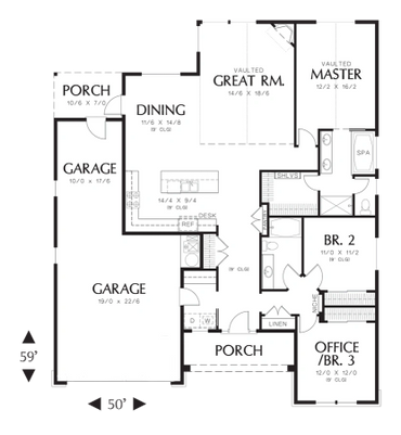 Neat and petite, this smaller one-story home is a picture of Craftsman delights. Notice the suggestion of pillars at the front entry, the transom window over the entry and the touches of cedar shingles and stone as accent. The floor plan lives large, with an extended two-vehicle garage on one side, a porch and patio to the rear and the option of two or three bedrooms. A central hallway connects interior spaces and leads through a laundry area to the garage. Use Bedroom 3 as an office if you choose - it's perfectly situated to receive clients who arrive at the front door. A full bath serves both Bedroom 2 and Bedroom 3. The master suite lies to the rear of the plan and features a vaulted ceiling and bath with spa tub, separate shower and walk-in closet. The great room can be vaulted and has a optional corner fireplace. It is open to the dining area and kitchen.